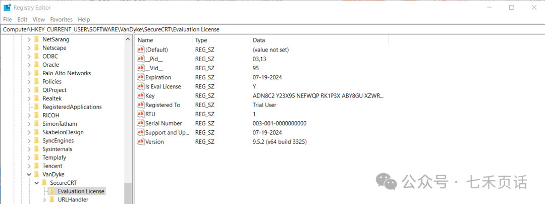 第一次开始使用SecureCRT之后,会在注册表中“HKEY_CURRENT_USER\Software\VanDyke\SecureCRT\”生成一个Evaluation License的注册信息: