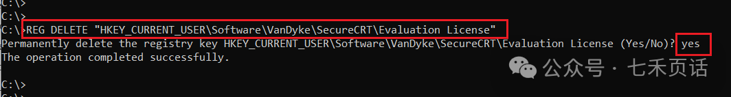 更快捷的方式是通过命令行直接删除,打开CMD之后输入 REG DELETE “HKEY_CURRENT_USER\Software\VanDyke\SecureCRT\Evaluation License” ,然后 yes 确认即可: