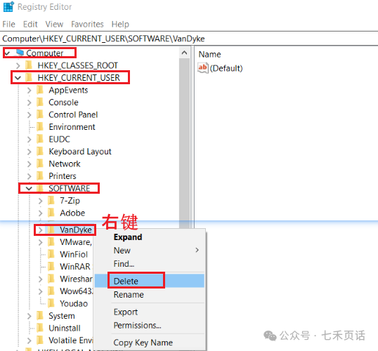 删除掉Computer\HKEY_CURRENT_USER\SOFTWARE和Computer\HKEY_LOCAL_MACHINE\SOFTWARE这两个路径下的VanDyke(针对只安装了SecureCRT):